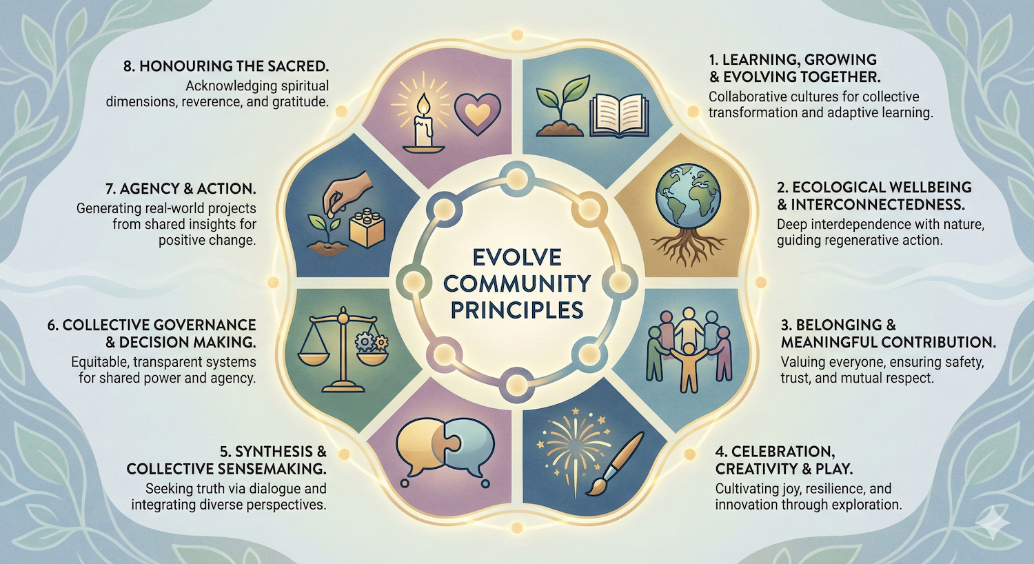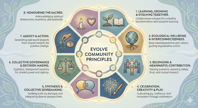 We aim for a fair and equitable distribution of power and agency within the Evolve organism by minimising centralisation wherever possible. We recognise that inclusion leads to greater trust, wisdom, and accountability. We prioritise transparency, active feedback loops, and clear checks on power. We recognise that good governance depends on meaningful participation, honest reflection, and systems that support continuous learning and evolution.